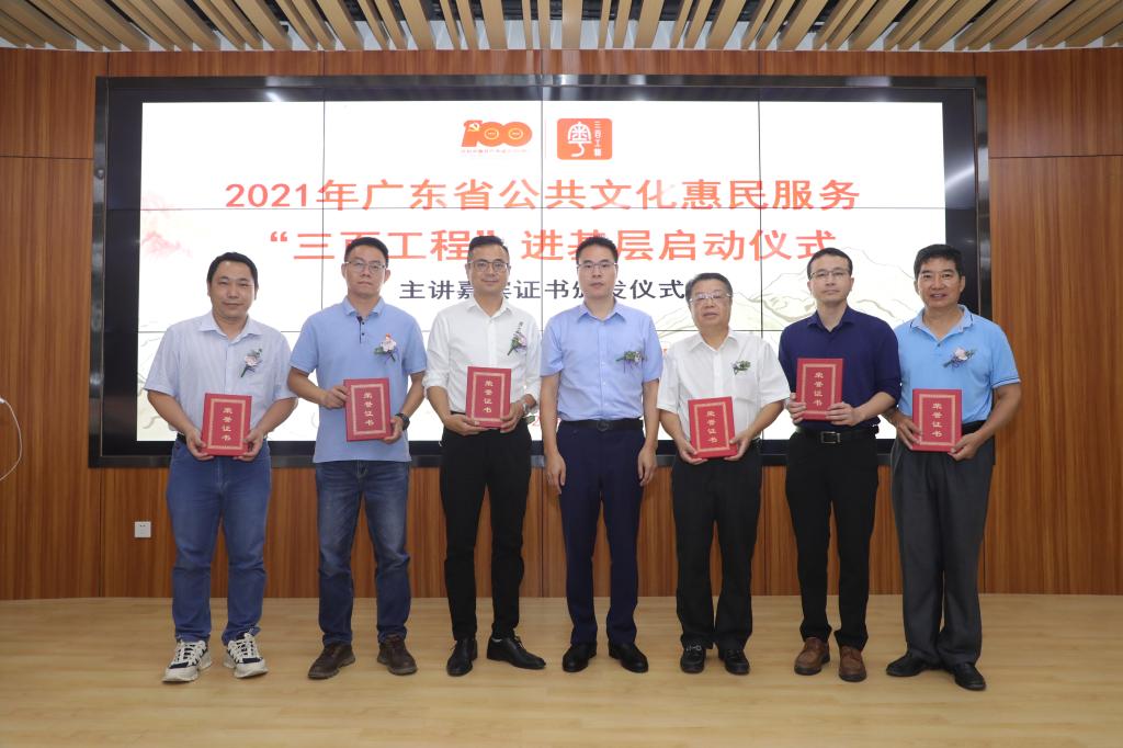 仪式最后,鼎顶展览有限公司总经理刘刚为2021年开展公共文化惠民“三百工程”进基层的授课专家刘生华教授、中山大学历史学系副教授柯伟明、广州市公安局荔湾区分局一级警长刘少廷等专家代表颁发了证书,并合影留念。