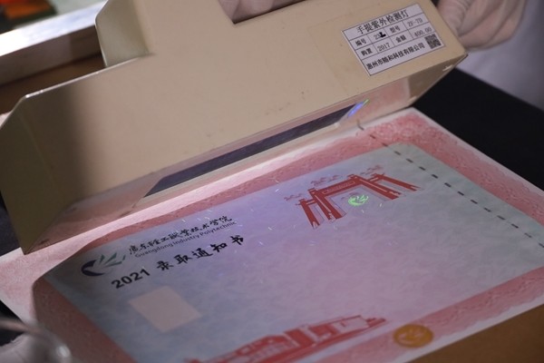 据悉,今年的录取通知书,是广东轻工职业技术学院“向华创新创业工作室”的一个真实技术开发项目。工作室团队由学校轻化工技术学院印刷数字图文技术、现代造纸技术、包装策划与设计、数字出版专业的师生组成。“职业教育要充分迎合产业升级变化的需求,包装印刷行业的升级换代,需要通过提高技术含量来增加产品的附加值,其中,防伪技术的应用是对包印产品赋能的重要手段。我们的专业群建设特色之一就是在包装印刷传统教学的基础上,依托真实项目,培养兼具包印防伪设计技能的高素质紧缺人才,目前广轻在这方面的人才培养走在国内高职的前列。”向华说道。