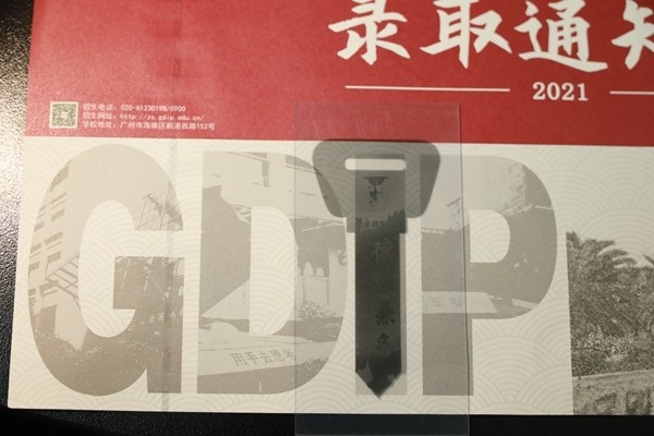 这张仅重8克的卡纸,是广东轻工职业技术学院2021级的录取通知书,“开锁”只是这张纸上采用的11种防伪技术之一。其他10种防伪技术包括:广轻专色红油墨、隐形紫外荧光防伪油墨、120g专版熊猫水印纸、开窗金属安全线、隐形紫外荧光纤维纸、微缩文字、花边+手绘角花、浮雕+版画、彩虹印刷、亚纳米激光雕刻烫金。