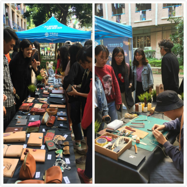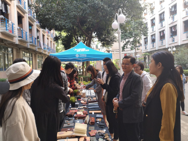 2018年11月29日上午,艺术设计学院组织一场别开生面的专业文化进社区活动。皮具专业同学在广州校区学生社区开展了手工皮具DIY体验活动,通过采取皮具制作过程展示与手工皮具作品展销相结合的方式,不仅向广大师生演示了皮具的制作工艺,而且满足了师生提升文化生活品味的需求,更为主要的是传播和宣传了专业文化。此次活动吸引了大量师生参与,现场气氛热烈,受到师生们一致好评。学校党委书记杜安国亲临活动现场,饶有兴趣地与同学们亲切交谈,了解手工皮具作品的制作流程,关心同学们所学专业的建设情况,并对同学们开展专业文化进社区表示高度赞赏。