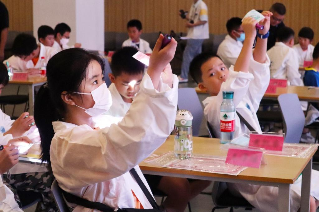 整场活动采用集中科普与分组辅导相结合的模式。各中小学生领到属于自己的科普研学证书半成品,并穿上白色的实验服后,集中在会议厅聆听“人民币的秘密”科普大讲座,向华教授带领学生们初步了解第五套人民币上的防伪技术知识。