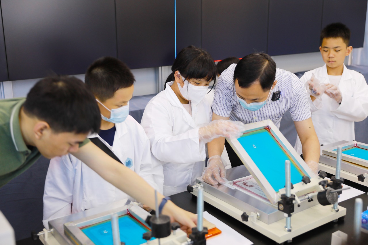 在分组体验活动“生活中的防伪技术”中,学生们在老师的指导下亲手印制校徽图案