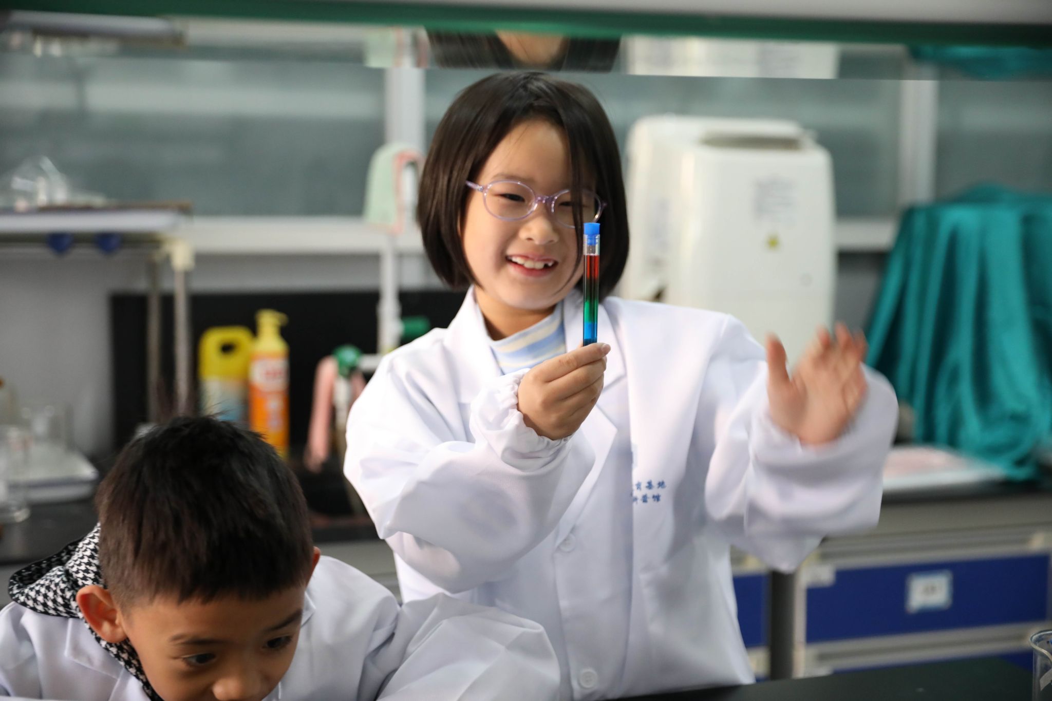 在等待密信完全烘干的同时,孩子们拿起桌上的滴管,小心翼翼地将各种颜色的化学试剂滴入试管中。由于这些试剂的密度不同,它们在试管内形成了层次分明的彩色液体,宛如一个美丽的“彩虹试管”。