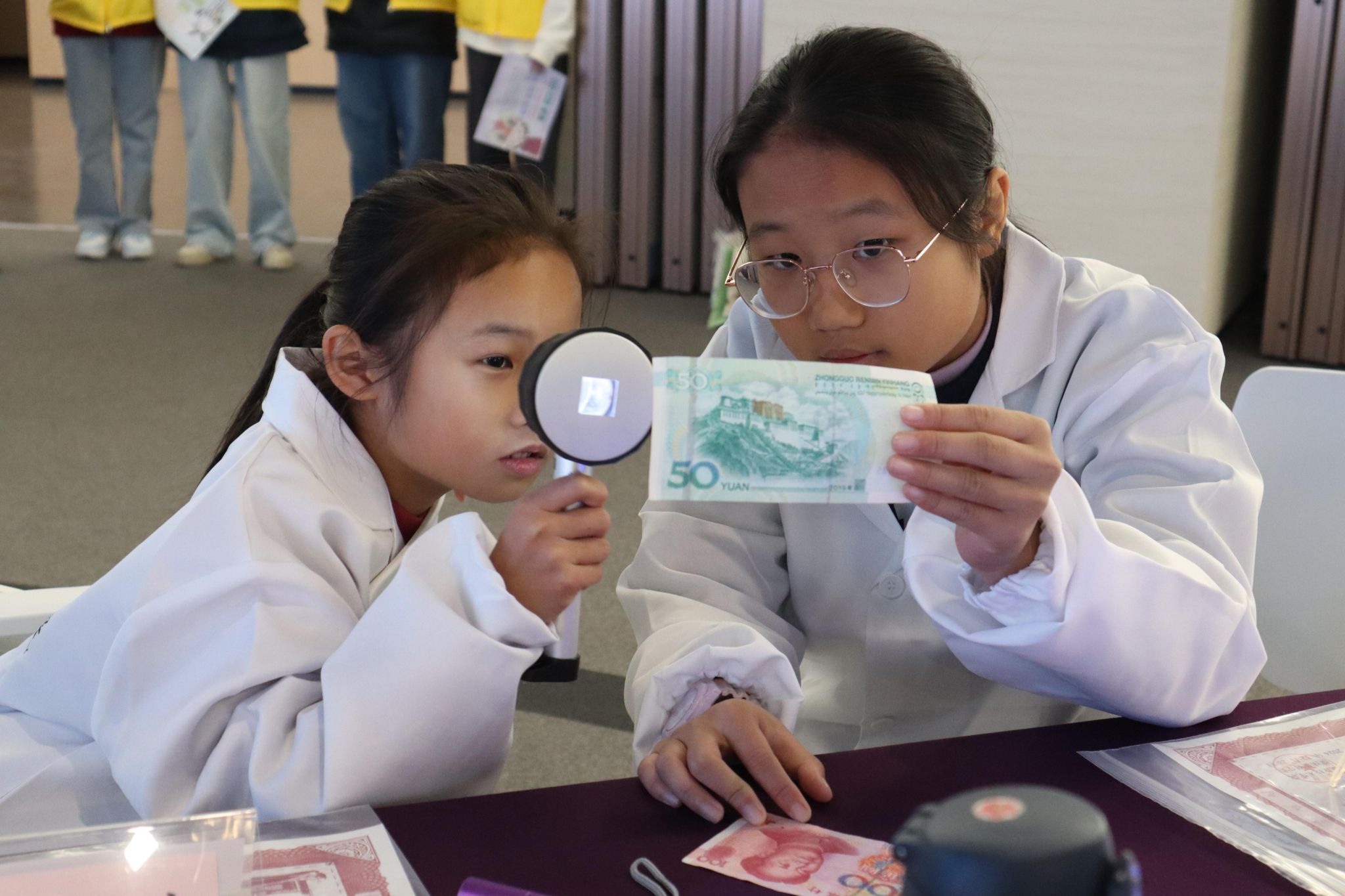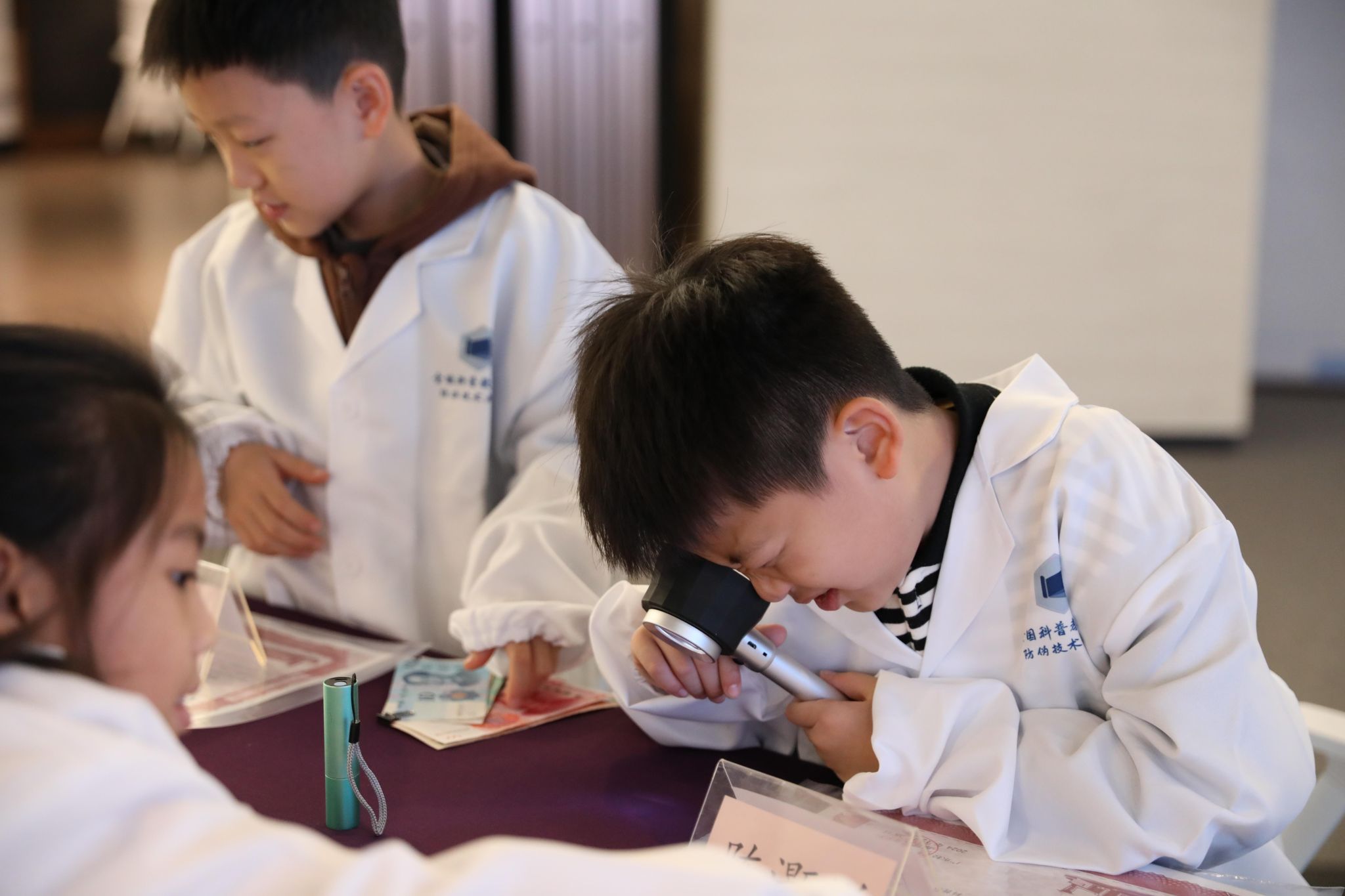 活动以“人民币的秘密”大讲座拉开序幕,主讲老师选用第五套人民币作为实例,运用通俗易懂的语言,向孩子们讲解直观易辨的公众防伪技术,如光变镂空安全线、光彩光变数字、人像水印、白水印和团花,以及需借助工具才能辨识的专业防伪技术,如缩微文字、荧光油墨及荧光纤维纸等。孩子们在老师的悉心引导下,运用放大镜、紫外灯等工具,逐步发现了人民币上的防伪标识,迈出了探索防伪奥秘的第一步。