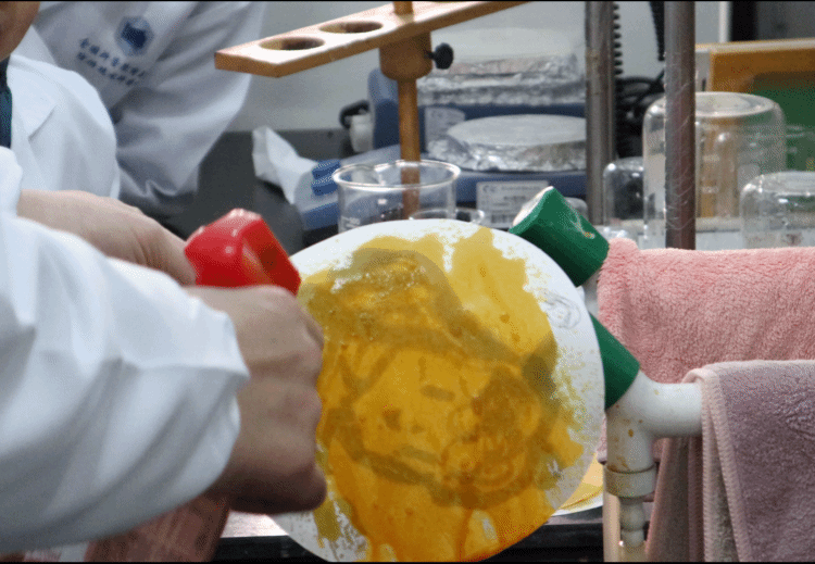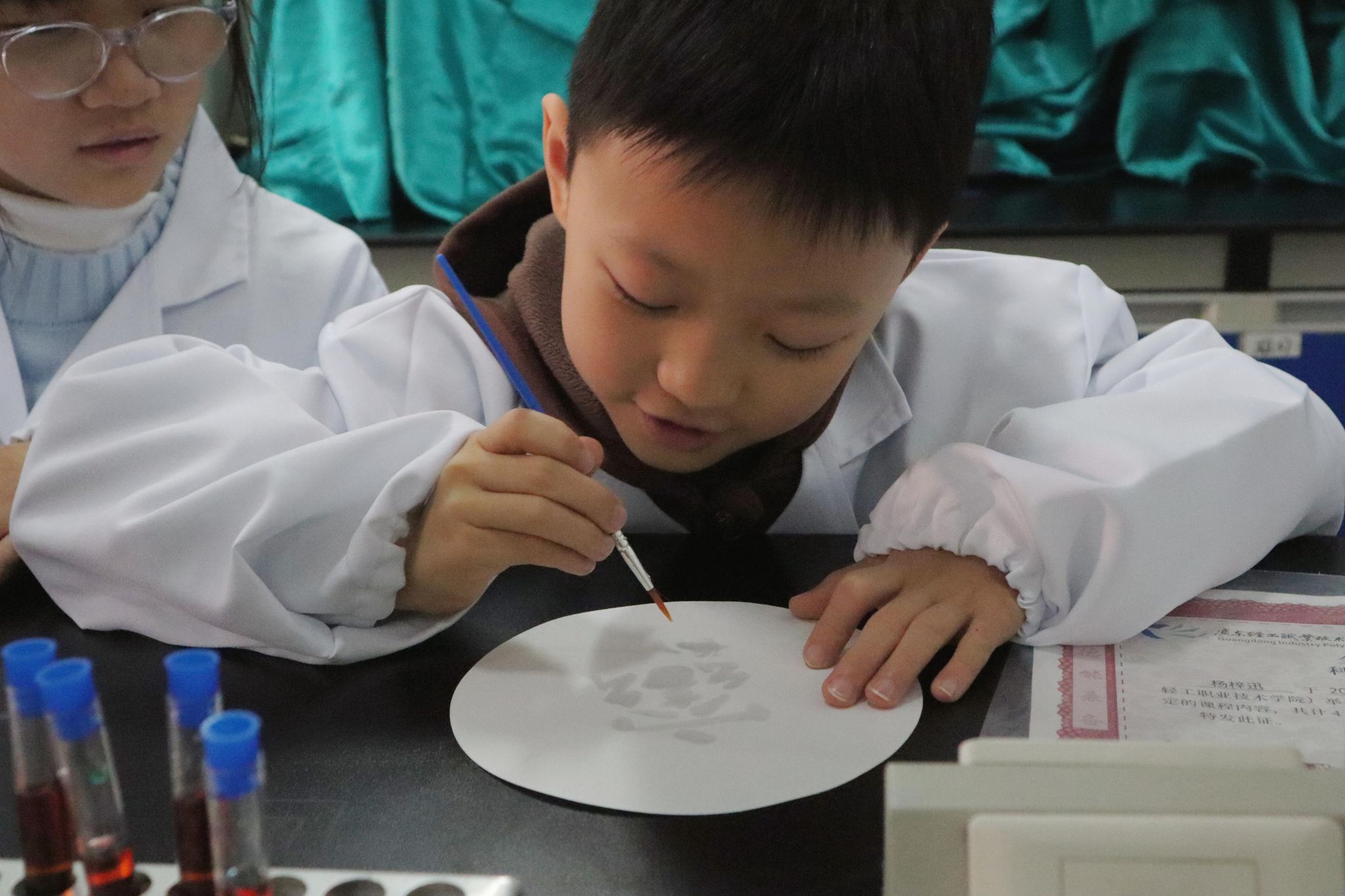 进入C区“神奇的化学”环节,孩子们迎来了一次精彩又有趣的体验:他们将要亲手制作一封能够隐形的密信,并创造一个色彩斑斓的“彩虹试管”。在老师的精心指导下,孩子们拿起毛笔,轻轻蘸取那瓶神秘的“隐形墨水”,然后在滤纸上缓缓书写下自己的小秘密。接着,这些写满秘密的纸张被送进了烘干机。当纸张再次出现在眼前时,孩子们惊讶地看到,原本清晰的文字竟然消失得无影无踪!随后老师拿起碘伏喷雾,轻轻喷洒在纸上,那些消失的文字仿佛被魔法唤醒,重新显现了出来,孩子们的脸上洋溢着兴奋和惊喜。