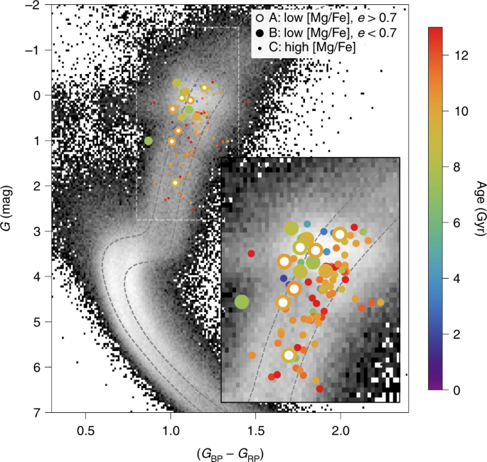 通过计算恒星的年龄,研究人员首次能够确定,从Gaia-Enceladus捕获的恒星与大多数在银河系内诞生的恒星相比,具有相似或稍年轻的年龄。
