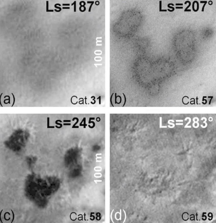 研究人员写道:“真菌在辐射强烈的环境中茁壮成长。连续的照片记录了类似真菌的火星标本从土壤中出现并增大,包括那些类似马勃菌(担子菌门)的标本。在球状标本被漫游者的车轮抹去后,新的球状标本出现--有些带有柄。序列记录了数以千计的黑色北极 ‘raneiforms’在春季生长到300米,并在冬季消失;这种模式每年春季重复,可能代表了黑色真菌、霉菌、地衣、藻类、甲烷菌和硫酸盐还原菌的大规模群落。黑色真菌-细菌样的标本也出现在漫游车的顶部。在三天的一系列照片中,一个裂缝内的白色无定形标本改变了形状和位置,然后消失了。”