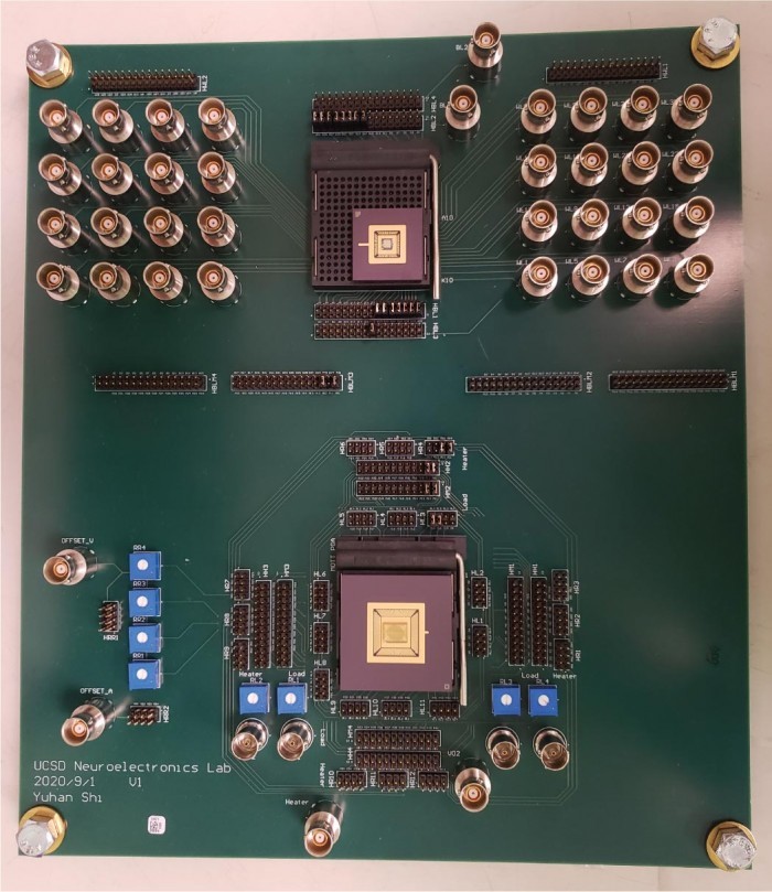 这种设备结构非常有趣和创新,通常情况下,处于莫特过渡期的材料会经历一个从绝缘到导电的突然转换,因为电流直接流过材料。在这种情况下,研究人员将电流流经材料顶部的纳米线,以加热它并诱发一个非常渐进的电阻变化。为了实现这个装置,研究人员首先制造了这些所谓的激活(或神经元)装置的阵列,以及一个突触装置阵列。然后,他们将这两个阵列集成到一个定制的印刷电路板上,并将它们连接在一起,创建一个硬件版的神经网络。