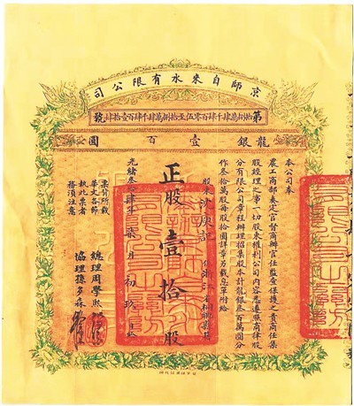 有了官方许可,还需筹措资金。展厅里,一张张花花绿绿的股票记录了自来水公司“招商集股”的历史。记者看到1908年公司第一次发行的股票,其外观采用碑式边框设计,文字沿袭中国传统书写格式,公司名称等均从右向左横书,没有采用西式股票形制。“洋务运动、维新变法后,清朝有识之士开始接纳并学习西方先进技术和经营方式,但在‘洋为中用’的过程中还保留着传统文化习惯。”北京自来水博物馆副馆长梁淑云说,“这些股票是观众最感兴趣的展品,股票样式可以说是中国早期股票的经典款。”