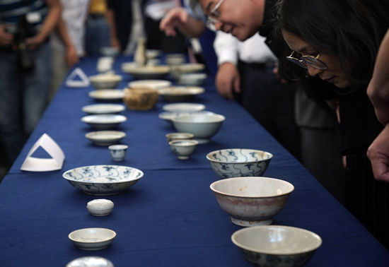 8月13日,嘉宾观看捐赠的瓷器。当日,泮庐集团捐赠“泰兴号”清代沉船瓷器仪式在北京中国国家博物馆举行。新华社记者 金良快/摄