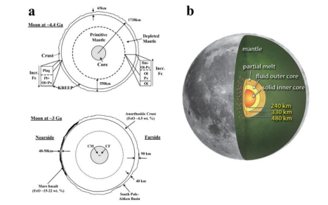 图1月球内部结构可能的解释。(a)月球岩浆被设定为深550km,下月幔由原始的未熔融物质组成。CM和CF分别代表质量中心和形态中心(源自Wieczorek, M. et al. in The constitution and structure of the lunar interior. 《Reviews in mineralogy and geochemistry, Vol 60》(eds Joliff, B. et al. Mineralogical Society of America, Chantilly, 2006),P225。(b)月球最内部的物理分层结构(源自Weber et al. Seismic detection of the lunar core. Science, 331, 309-312(2011))。