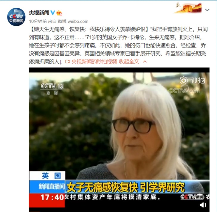 3月30日消息 据央视新闻消息,71岁的英国女子乔⋅卡梅伦,生来无痛感。据她介绍,她在生孩子时都不会感到疼痛。不仅如此,她的伤口也能快速愈合,这一点引起学术界的研究。