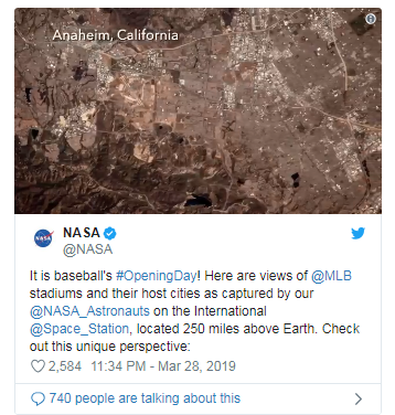 据外媒CNET报道,在美国职棒大联盟(Major League Baseball,简称MLB)开赛日当天,对于球迷来说,花生、啤酒和Cracker Jack零食已成为看球标配。不过,美国宇航局(NASA)正在从更远的距离庆祝美国职棒大联盟2019赛季的首场比赛。