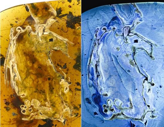 “煎饼鸟”标本自然光照片与荧光照片 邢立达 供图