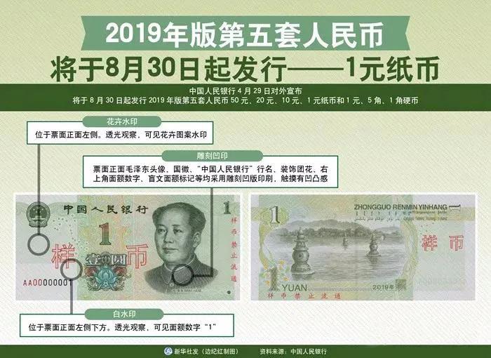 中国人民银行于2019年8月30日发行2019年版第五套人民币50元、20元、10元、1元纸币时说明:2019年版第五套人民币,在保持现行第五套人民币主图案等相关要素不变的前提下,对票(币)面效果、防伪特征及其布局等进行了调整,采用先进的纸币防伪技术,提高防伪能力和印制质量,使公众和自助设备易于识别。