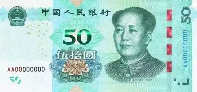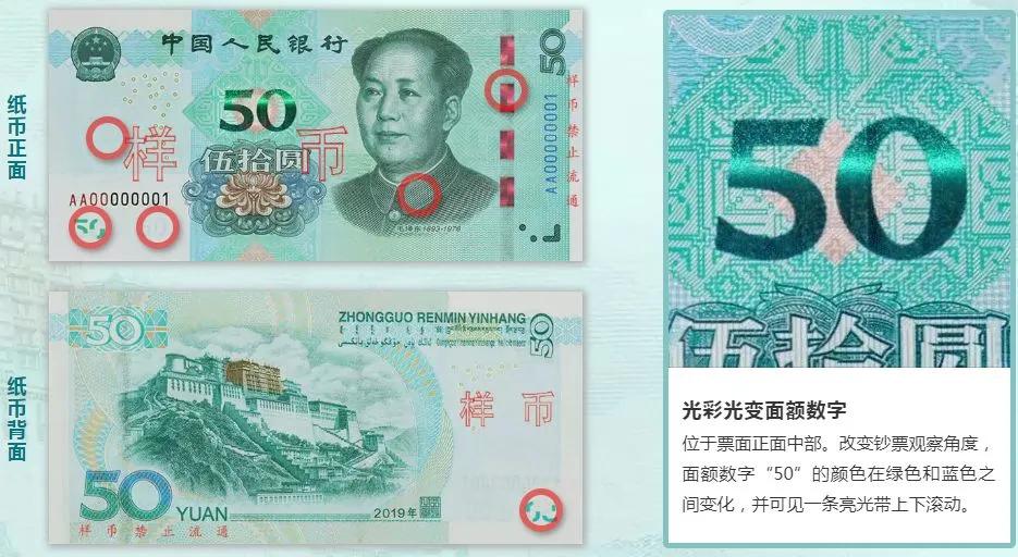 2019年版第五套人民币50元、20元、10元纸币票面中部印有光彩光变面额数字,改变钞票观察角度,面额数字颜色出现变化,并可见一条亮光带上下滚动。