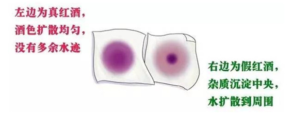 也可以将白色餐巾纸叠放在桌上,滴几滴红酒,均匀扩散就是真酒,那是因为假红酒色素颗粒大,会沉淀在纸巾中间,往外扩散只是水迹。