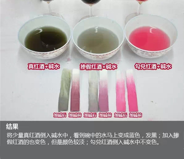 试:将葡萄酒中滴一滴纯碱溶液,颜色变蓝则为葡萄酒(颜色越深越好),不变色是假冒葡萄酒,红中带黑表示掺杂酒。