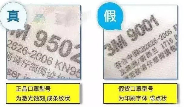 看印刷,3M口罩都是由激光打印的,打印痕迹呈45度斜角。