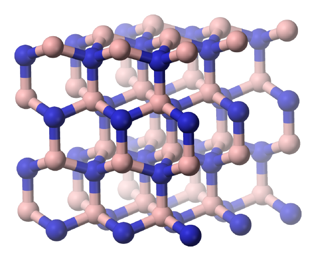 除了碳之外,其它许多原子或化合物也可以构成晶体,氮化硼就是其中之一。硼和氮在元素周期表上分别居于第五和第七位,两种元素组合在一起,可以产生各种各样的可能性,包括非晶形、六方晶系(类似于石墨)、立方体(类似于钻石,不过结构强度稍差一些)、以及纤锌矿型。