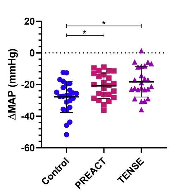 有趣的是,“预激活”与“绷紧”两种方法对于平均动脉压和症状的改善程度没有显著差异,但在具体的血流动力学数据上却有区别,表明这两种方法是通过不同的方式达到减小血压下降幅度、缓解症状的目标的。