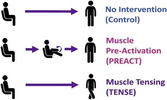 24名平均年龄32岁的女性参与了一项实验,她们都是严重的IOH患者,曾有过站起来后立即晕倒的经历。每个参与者都进行了3次从坐到站的实验。首先进行没有任何干预的对照组,而后按照随机顺序进行分别使用“预激活”和“绷紧”两种方法干预的实验组。