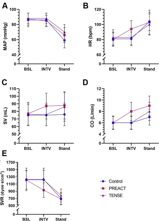 控制组(蓝色)、“预激活”组(粉色)和“绷紧”组(紫色)在基线(BSL,指静坐10分钟的最后30秒)、干预期间(INTV)和起立后(Stand,对应平均动脉压达到最低值的时刻)的血流动力学数值变化。图A为平均动脉压(MAP),图B为心率(HR),图C为每搏输出量(SV),图D为心输出量(CO),图E为总外周阻力(SVR)。(图片来源:原论文)