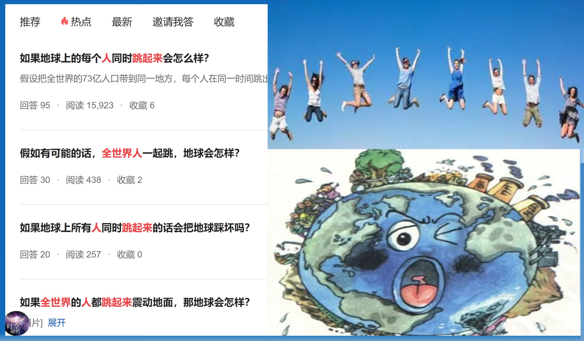 网络上常常看到诸如此类的问题,觉得很奇葩,一笑置之。看得多了,见许多网友一再提出这种问题,甚至有人认为就像一艘大船的所有人集中在一边一跳,船就有可能倾覆一样,全世界所有人聚集起来共同一跳,就有可能撼动地球甚至毁灭地球。