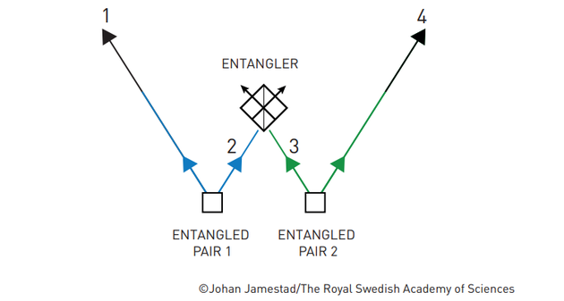 两对纠缠粒子从不同的来源发射。每对粒子中的一个粒子以一种特殊的方式相互纠缠而聚集在一起。然后,其他两个粒子(图中的1和4)也被纠缠在一起。通过这种方式,两个从未接触过的粒子可以纠缠在一起。