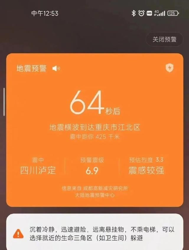 2022年9月5日12时52分,四川甘孜州泸定县发生6.8级地震。有不少媒体报道,地震发生前,四川、重庆居民发了自己手机中的地震预警,其中一名重庆网友预警截图显示,“64秒后地震横波到达重庆市江北区,震中四川泸定,预警震级6.9级,震感较强。”